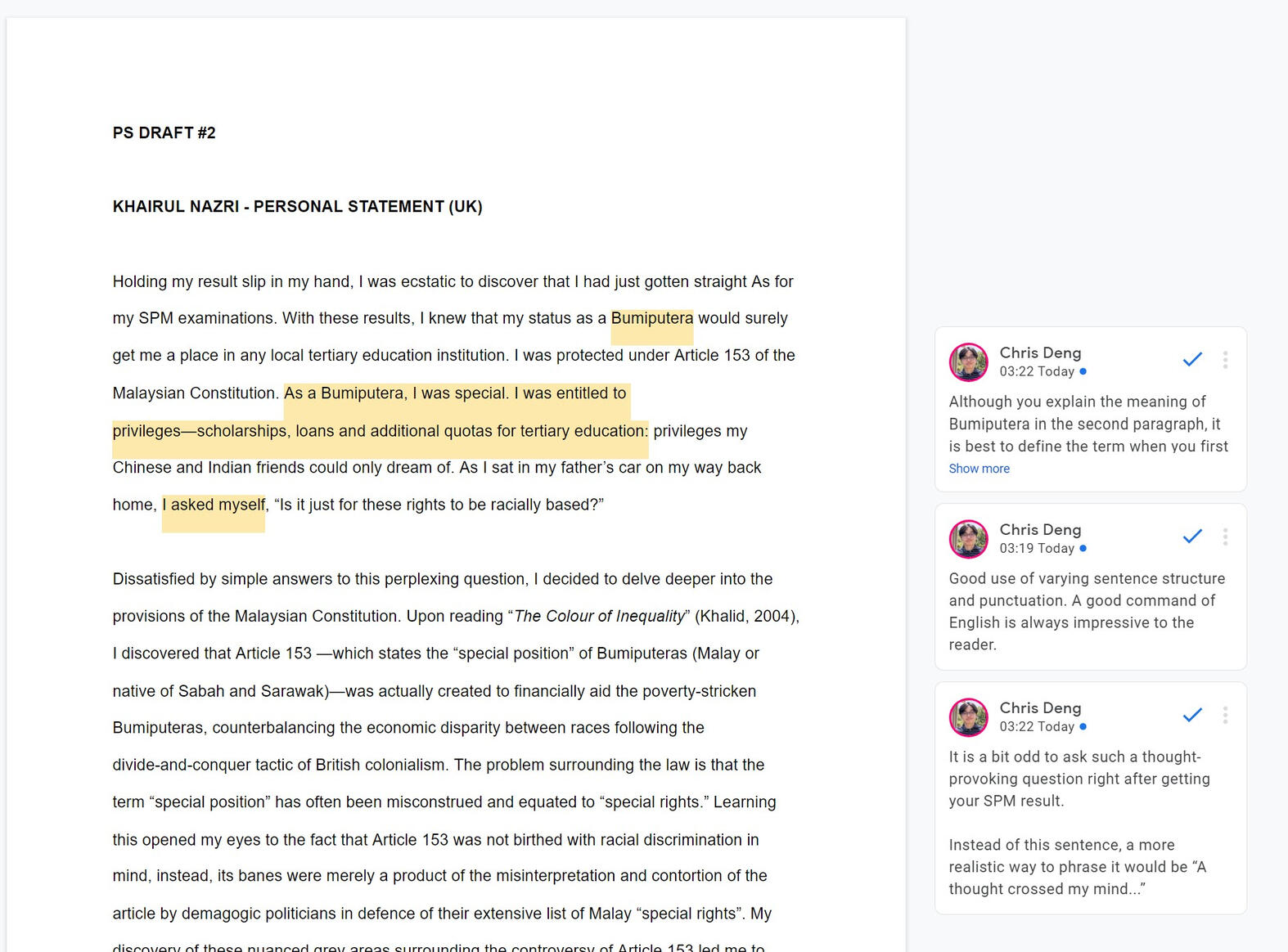 Chris Deng is an Oxford Law offer holder and a Yayasan Khazanah scholar. He heldoffers from LSE and King's College London to read Law.Shouldering the responsibility of a Peer Tutor in both High School and College, Chris is experienced in teaching and relaying information to his students. He believes in stripping down concepts to its very core and coming up with clever formulas to summarize complex subjects.A true believer in the maxim “learn more by studying less”, he wishes to share his knowledge with you, in your endeavour to perfect your University Applications and Admission Test.